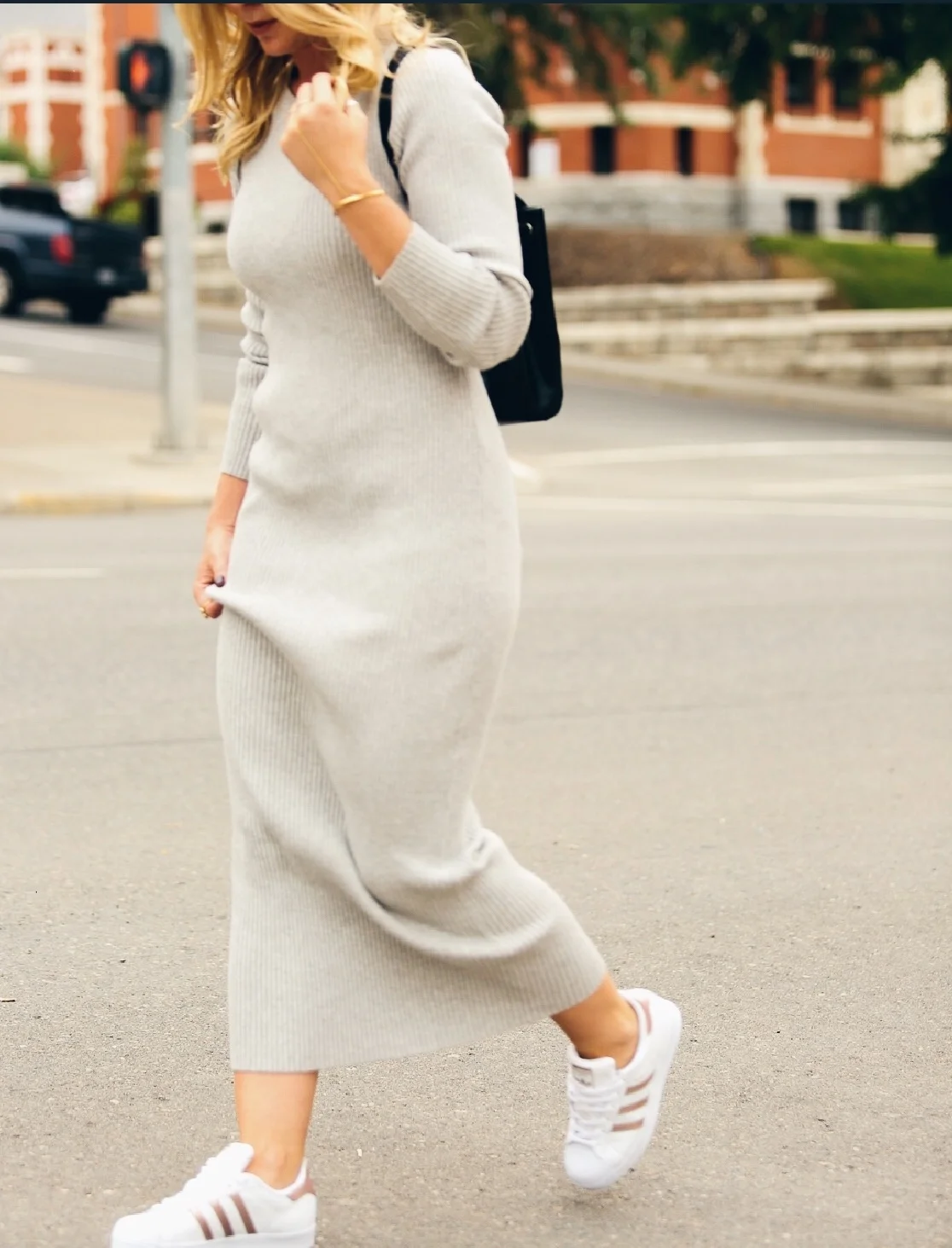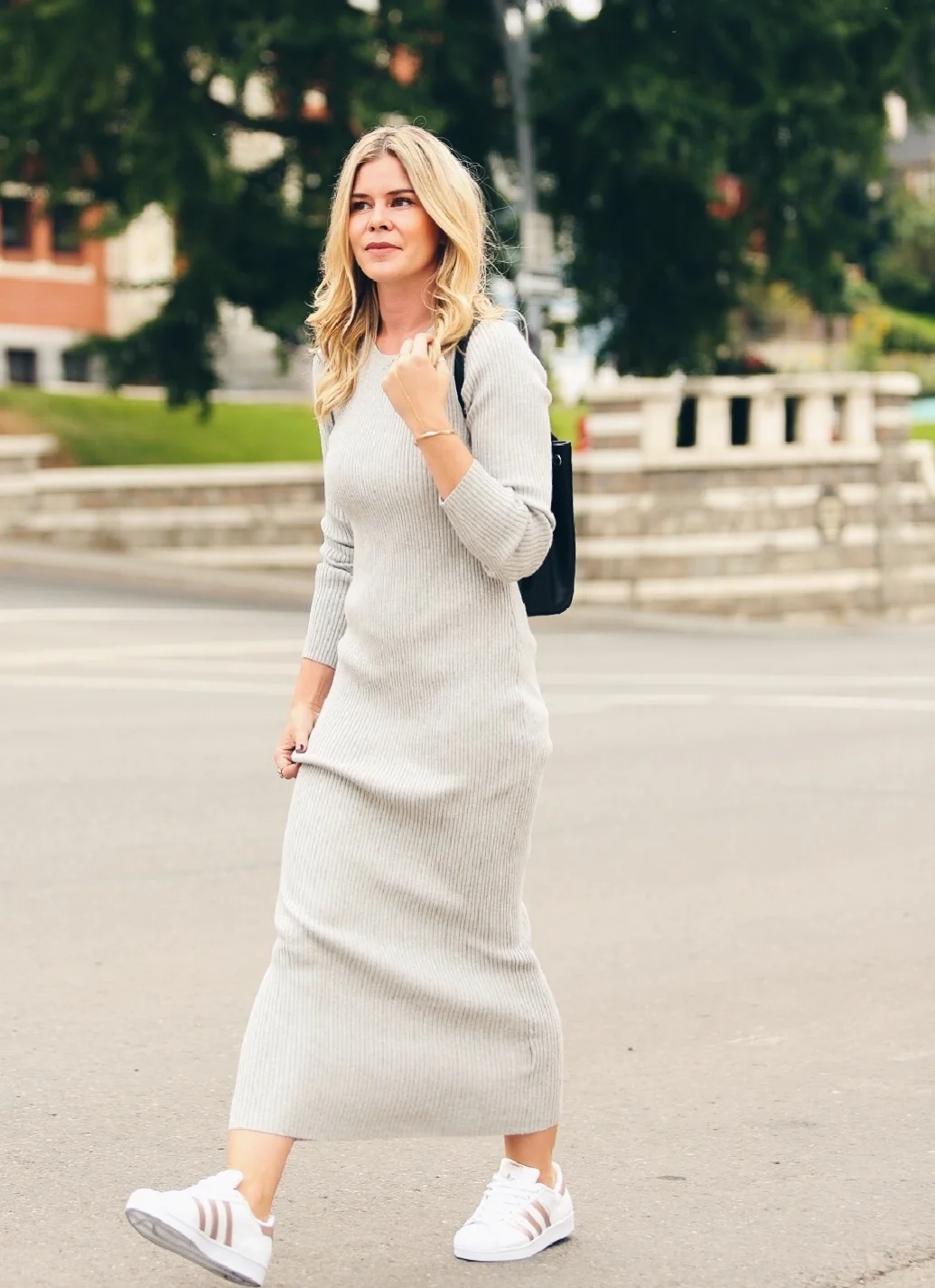 I love the minimalist look of this dress. You can dress it up or dress it down and it's so easy to wear. It is the perfect length to wear with sneakers for those busy days around town.